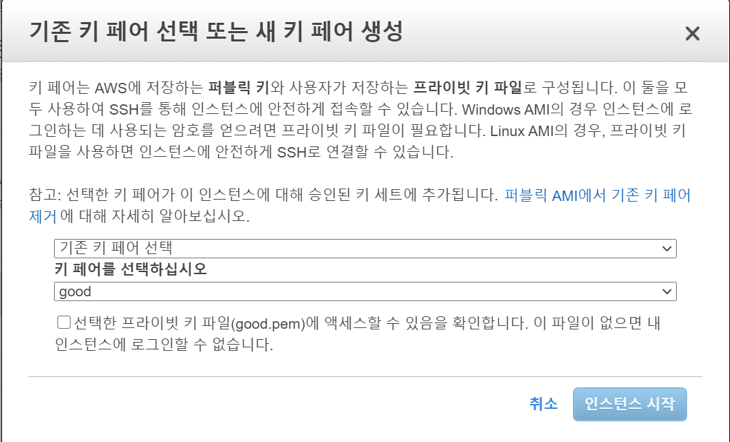 키페어를 '새 키페어 생성'으로 바꾸고 파일이름을 설정한다. 나는 보시다시피 'good'으로 지었다.