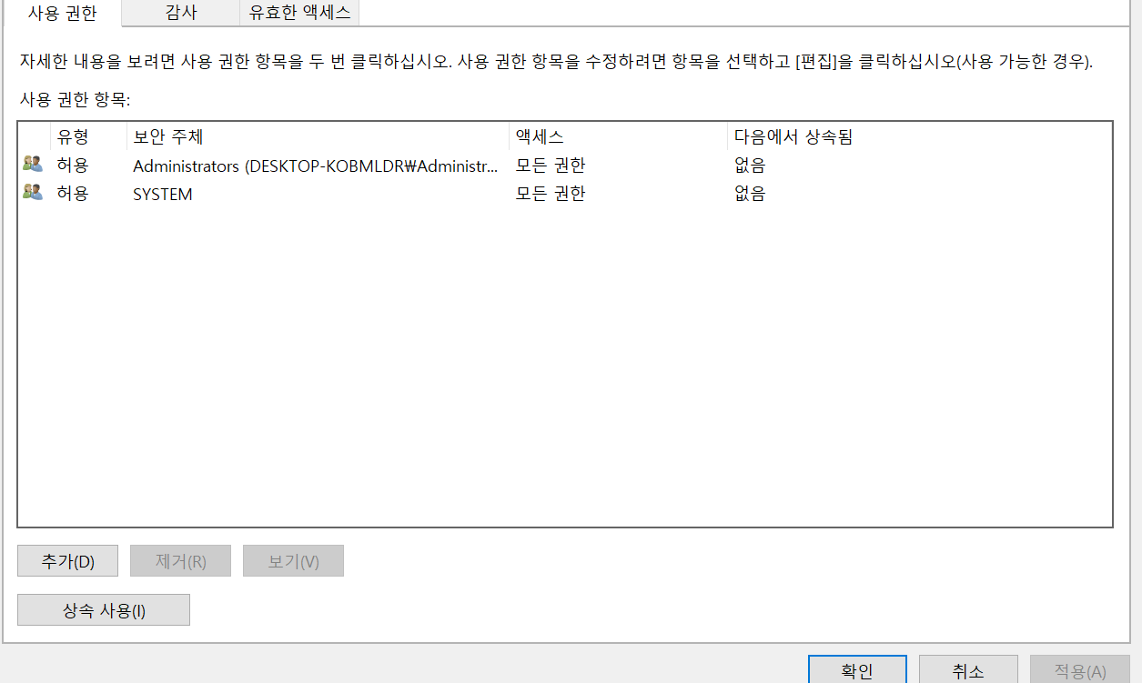 이런 설정이 나오는데 Administrators 와 SYSTEM을 제외한 것들에게는 권한을 모두 회수하고