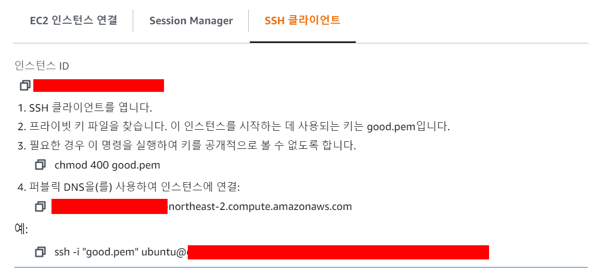 그럼 이런 화면이 뜬다. SSH 클라이언트를 클릭하고 맨아래 4번을 보면 ssh -i로 시작하는게 우리의 접속 키워드다.
