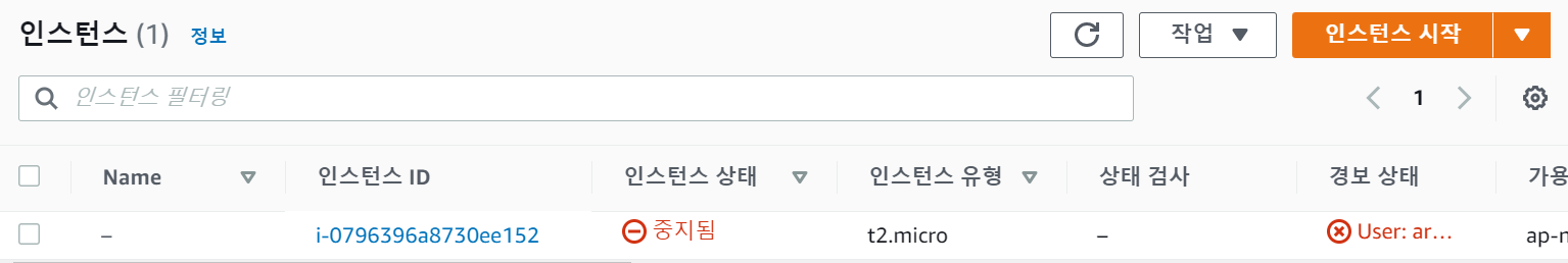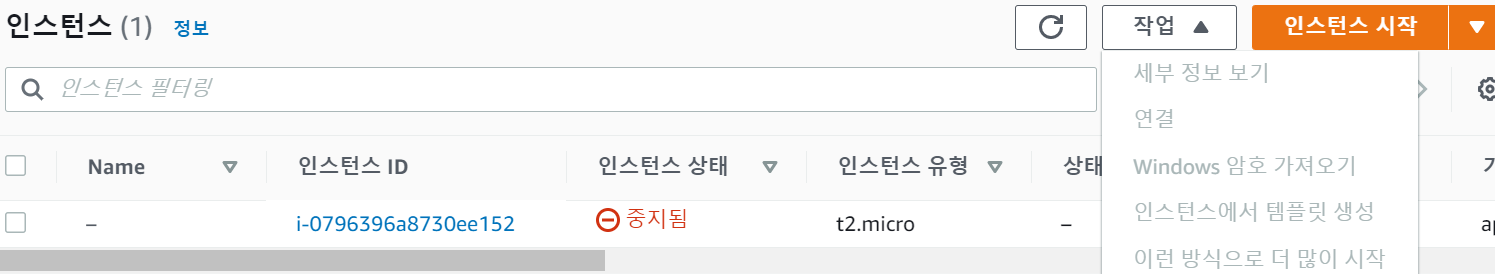 실행이 완료되면 이런 화면이 뜬다! 나는 인스턴스를 중지했기 때문에 '중지됨' 이지만 처음 시작하면 실행중 이라고 되있다. 여기까지 끝나면 아까 다운받았던 키페어 파일로 간다 (good.pem 이런식으로 저장되있음)