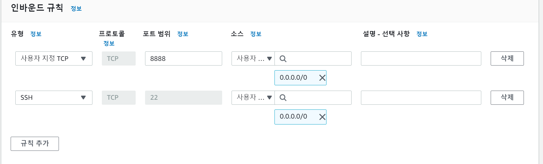 규칙 추가를 해서 '사용자 지정 TCP' 포트범위 8888 소스 0.0.0.0/0 으로 규칙을 만든 후 저장 하면 된다.